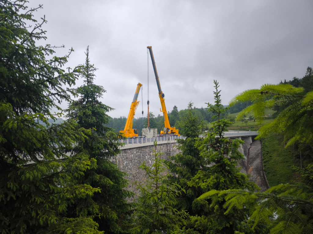 Assembly work directly on the Pastviny Dam. The deployment of two Liebherr mobile cranes was required not only due to the weight of the load but also because of the challenging terrain and limited space. Thanks to well-coordinated crews and precise planning, the entire operation was completed without complications.