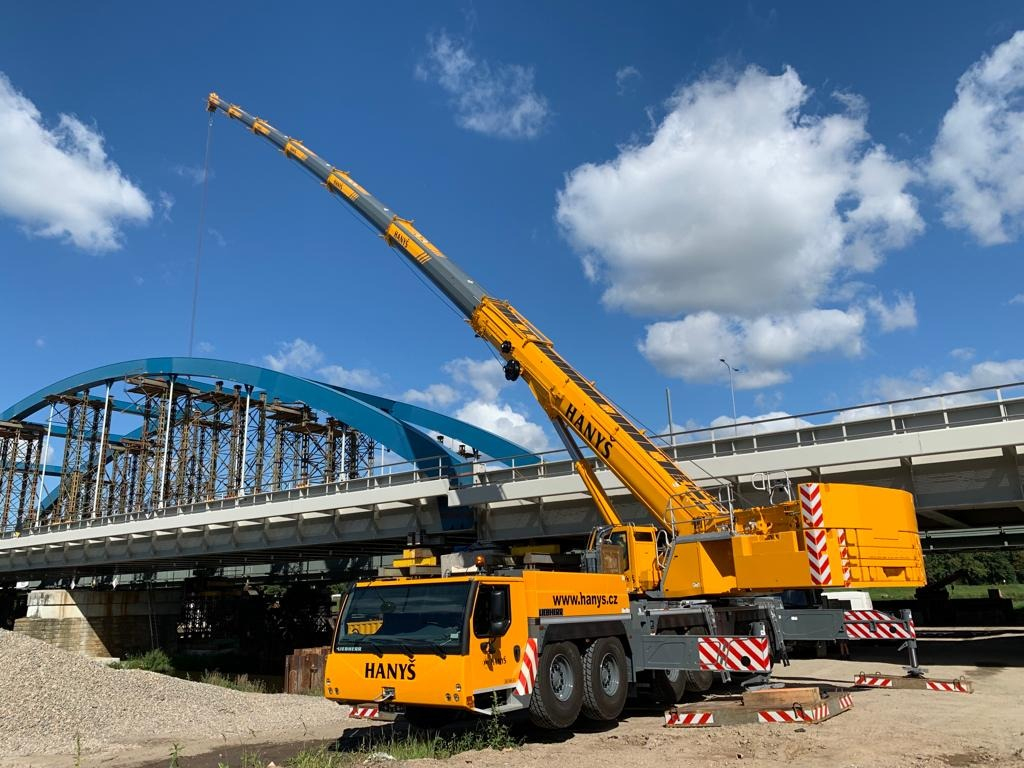 At the construction site of a prefabricated hall, one of the main arch segments is currently being installed. A crane from our fleet is ensuring the precise placement of the structure into the prepared foundations.