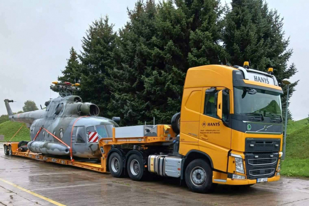 The photo shows the transport of a helicopter using a special low-bed trailer. This type of cargo places high demands on planning, securing, and handling throughout the entire route.